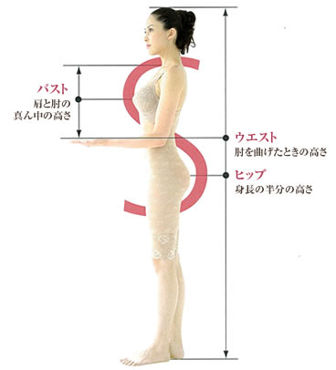 女性がもっとも魅力的に見える体形は、身体を真横から見て左右対称なS字ラインになるシルエットです。 年齢に関係なく、バストは肩と肘の真ん中の高さ、ウエストは腕を曲げた時の肘の高さ、ヒップは身長の半分の高さが美しい理想の体型で、ゴールデンプロポーションと呼ばれています。 マミエールの下着を着けて鏡を見た時、前とは違うS字ラインボディに近付いていることにきっと気づくはずです。